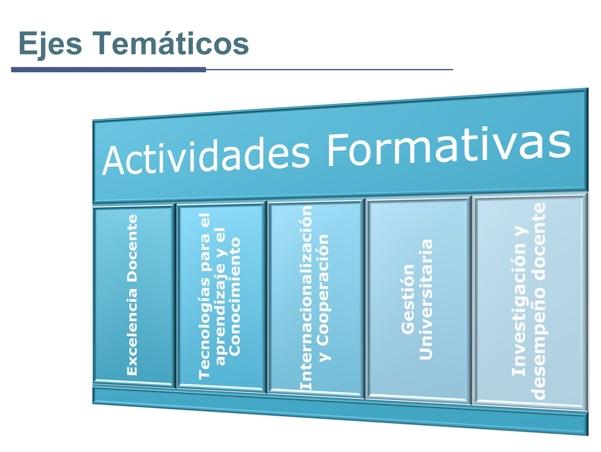 Los Planes de Desarrollo se diseñan definiendo las competencias y actuaciones que se van a trabajar para su desarrollo, estando estos constituidos por una o varias actividades formativas. Se han establecido cinco ejes temáticos en las que encuadrar los Planes de Desarrollo: excelencia docente, tecnologías aplicadas a la docencia, internacionalización y cooperación, gestión universitaria e investigación y desempeño docente.