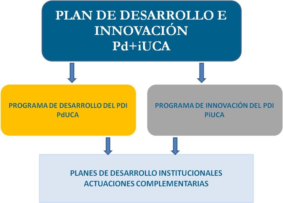 Se ha diseñado un Plan de Desarrollo e Innovación del PDI (Pd+iUCA) que se desplegaba en dos programas interrelacionados y dependientes que tenían como foco de atención dos referentes: la formación entendida como desarrollo de las personas y la innovación educativa, en el sentido de acción para provocar cambios y mejoras en el desarrollo personal/profesional y en la organización. Así nacen el Programa de Desarrollo del PDI (PdUCA) y el Programa de Innovación del PDI (PiUCA), confluyendo ambos programas en Planes de Desarrollo Institucionales y actuaciones concretas.