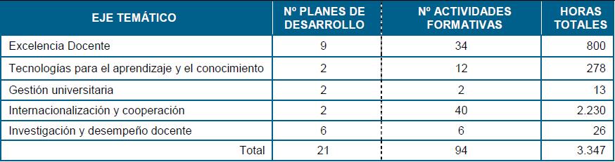 Los Planes de Desarrollo planificados para este curso académico se resumen la tabla 5. Se contabilizan todos los planes desarrollados en las distintas ediciones Esta planificación está actualmente en ejecución. Hasta la actualidad han participado 541 PDI.