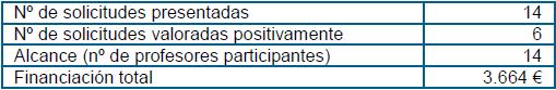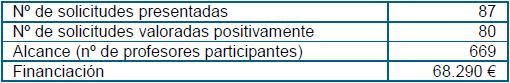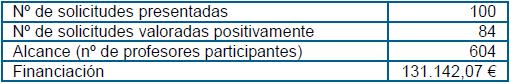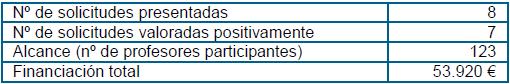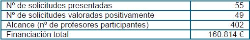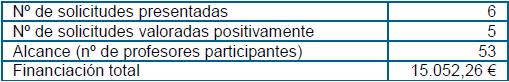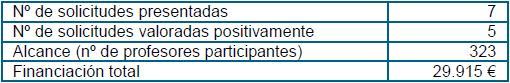 Con el doble objetivo de atender las necesidades detectadas en los centros y de fomentar la innovación y la formación en innovación, desde este Vicerrectorado se llevaron a cabo dos actuaciones cuyos resultados se ofrecen en las dos tablas siguientes.