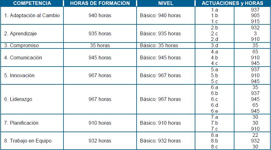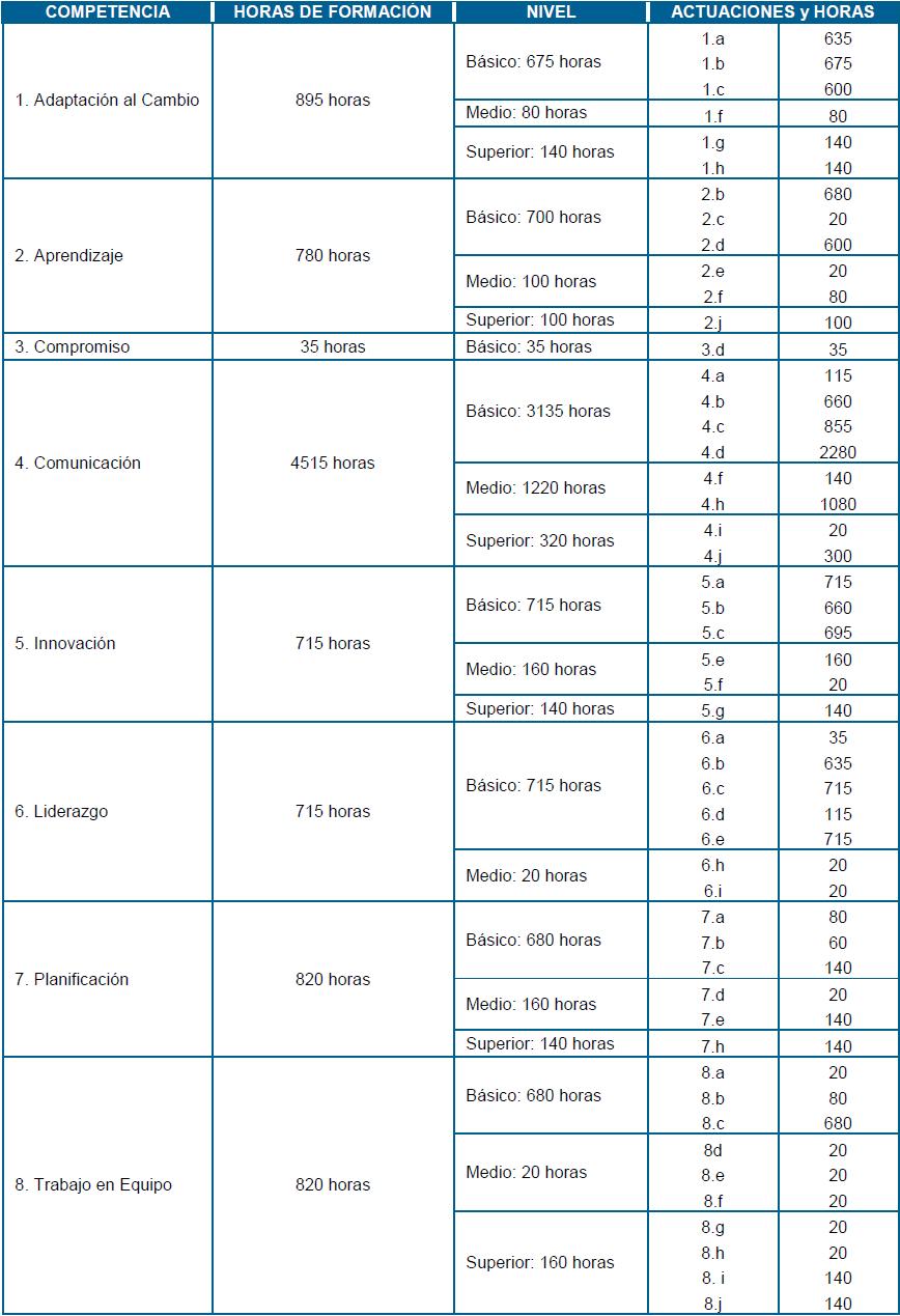 En la siguiente tabla ofrecemos la relación de las horas de formación desarrolladas en los Planes de Desarrollo por cada competencia, nivel y actuaciones asociadas a la misma. Para poder interpretar la tabla debemos tener presente que las horas se han calculado sobre la base de las actuaciones trabajadas en cada Plan de Desarrollo multiplicadas por el número de horas totales de éstos. Es decir, hemos considerado que el desarrollo de cada actuación y de su competencia durante cada Plan de Desarrollo se ha realizado transversalmente durante toda su duración.