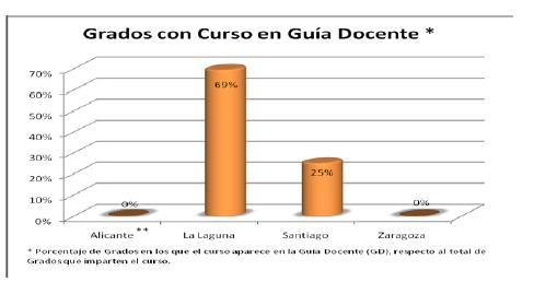 En cuanto a la tasa de inclusión, en este curso académico sólo la ULL y la USC tienen incorporada esta actividad de aprendizaje en las Guías Docentes de las asignaturas en las que se integra (en un 69 y un 25% de los casos, respectivamente). Es objetivo para el curso 2011/12 que todos los grados en los que se integra el curso lo reflejen en las Guías Docentes de la/s asignatura/s de primer curso con la que se colabora.