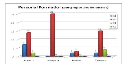 - Porcentaje de personal formador/ total de personal de la biblioteca en disposición de formar. En el siguiente gráfico se presenta la situación del personal bibliotecario que ha participado en el proyecto según categorías profesionales.