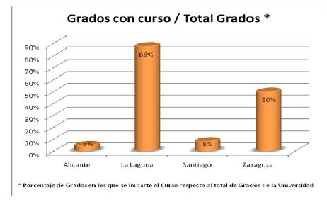 1. Impacto interno en cada universidad. La laguna que ya tenía incorporado el curso en el 80% de los grados en el curso 2010/201, puede fácilmente acercarse al 90% en 2011/2012, Zaragoza de un 50% prevé un 80% y Santiago del 8% llegará al 60%.