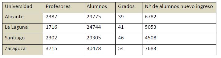 Nos referimos al alcance de cada una de las cuatro universidades en cuanto a número de profesores, total de alumnos, número de grados y número de alumnos de nuevo ingreso que son a quienes va afectar la formación (Tabla 1), así como la referencia a la red de trabajo cooperativo que planificará y llevará a cabo la implantación de un modelo común de curso teniendo en cuanta una serie de aspectos y en base a unos objetivos comunes.