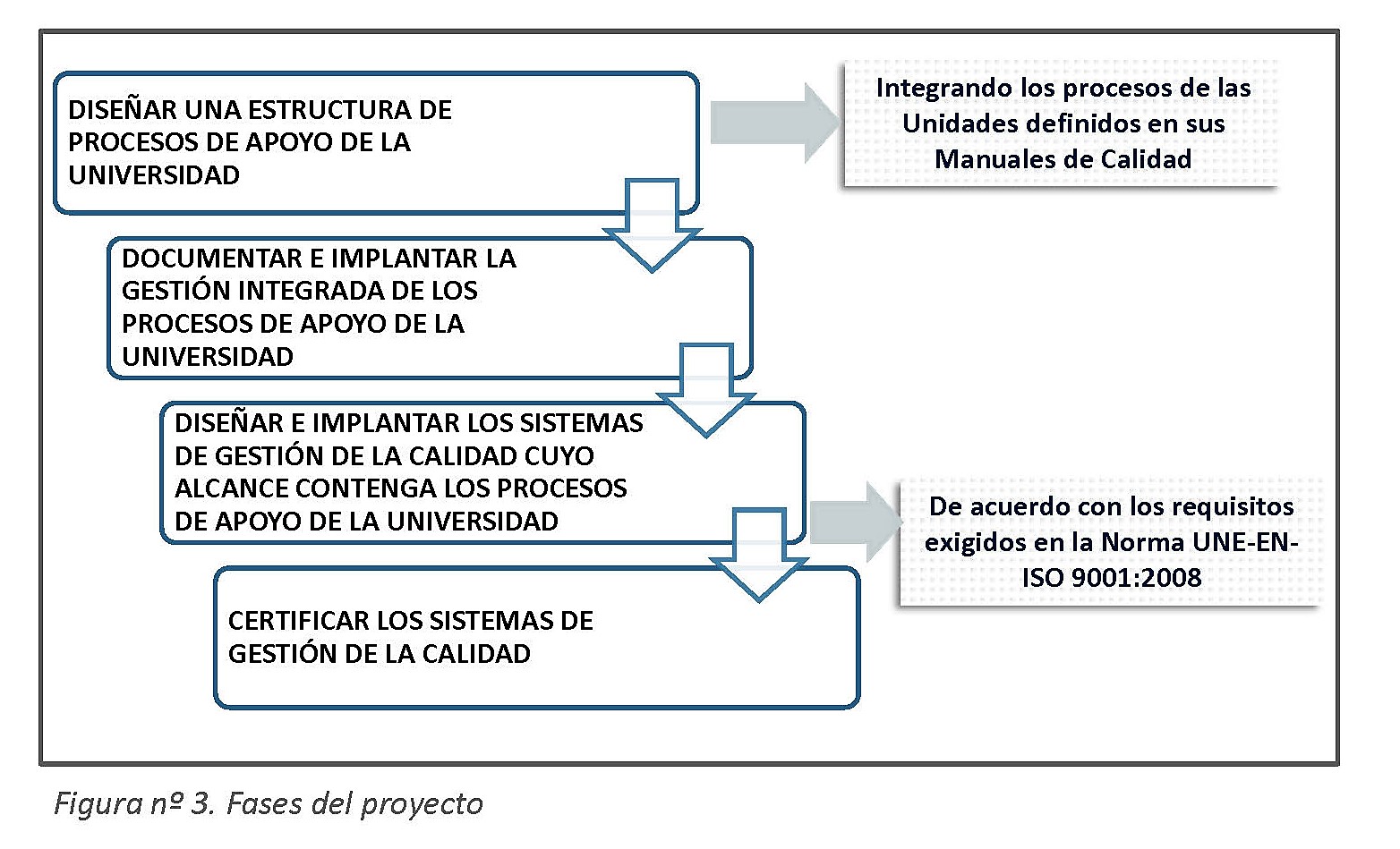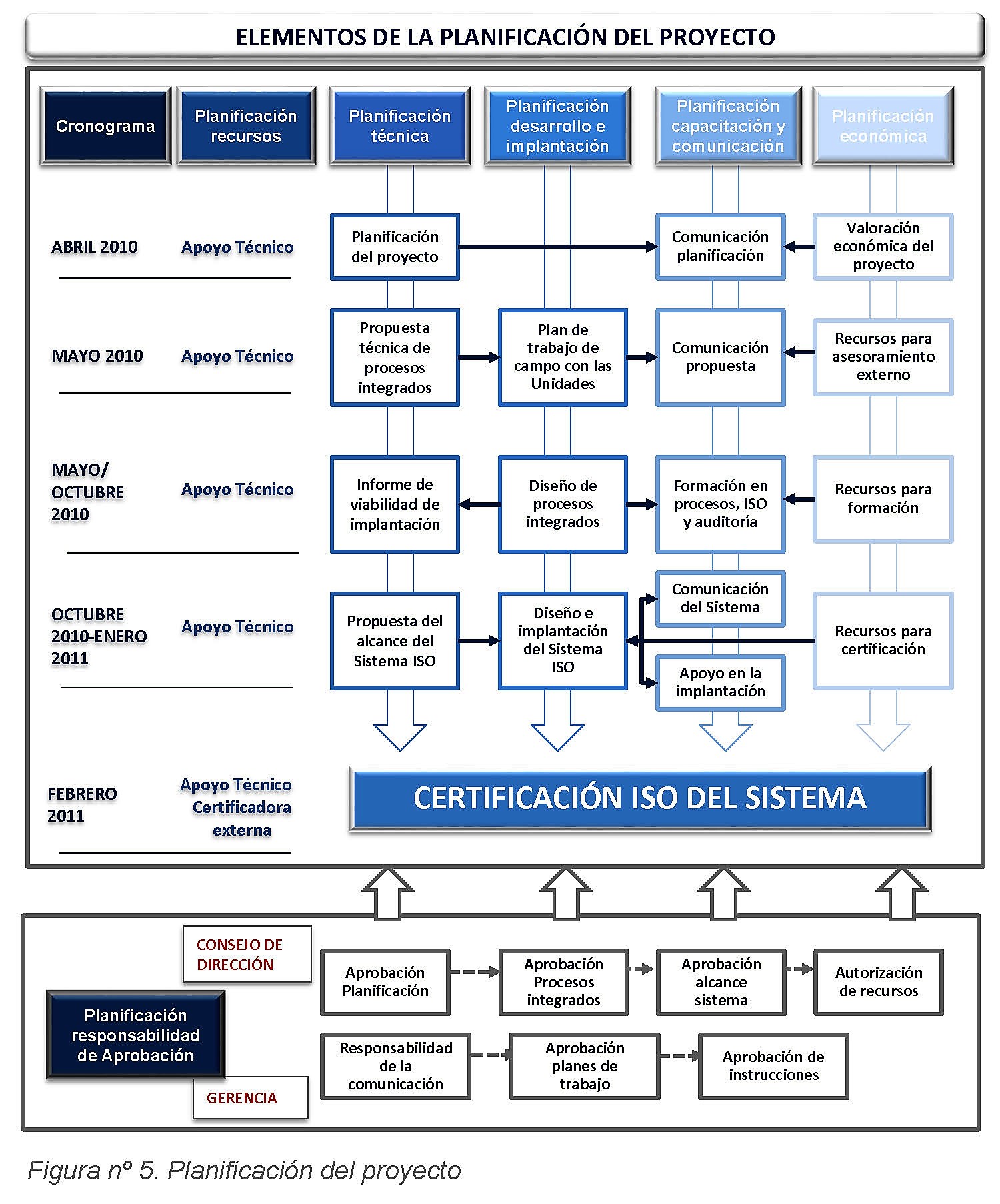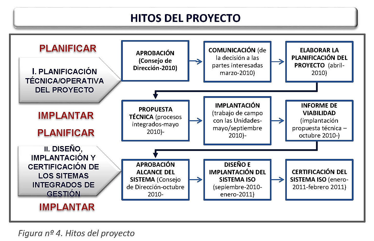 Para cada fase se definieron los hitos del proyecto en una secuencia combinada de planificación de actividades, aprobación e implementación. Se representa en la figura nº 4.