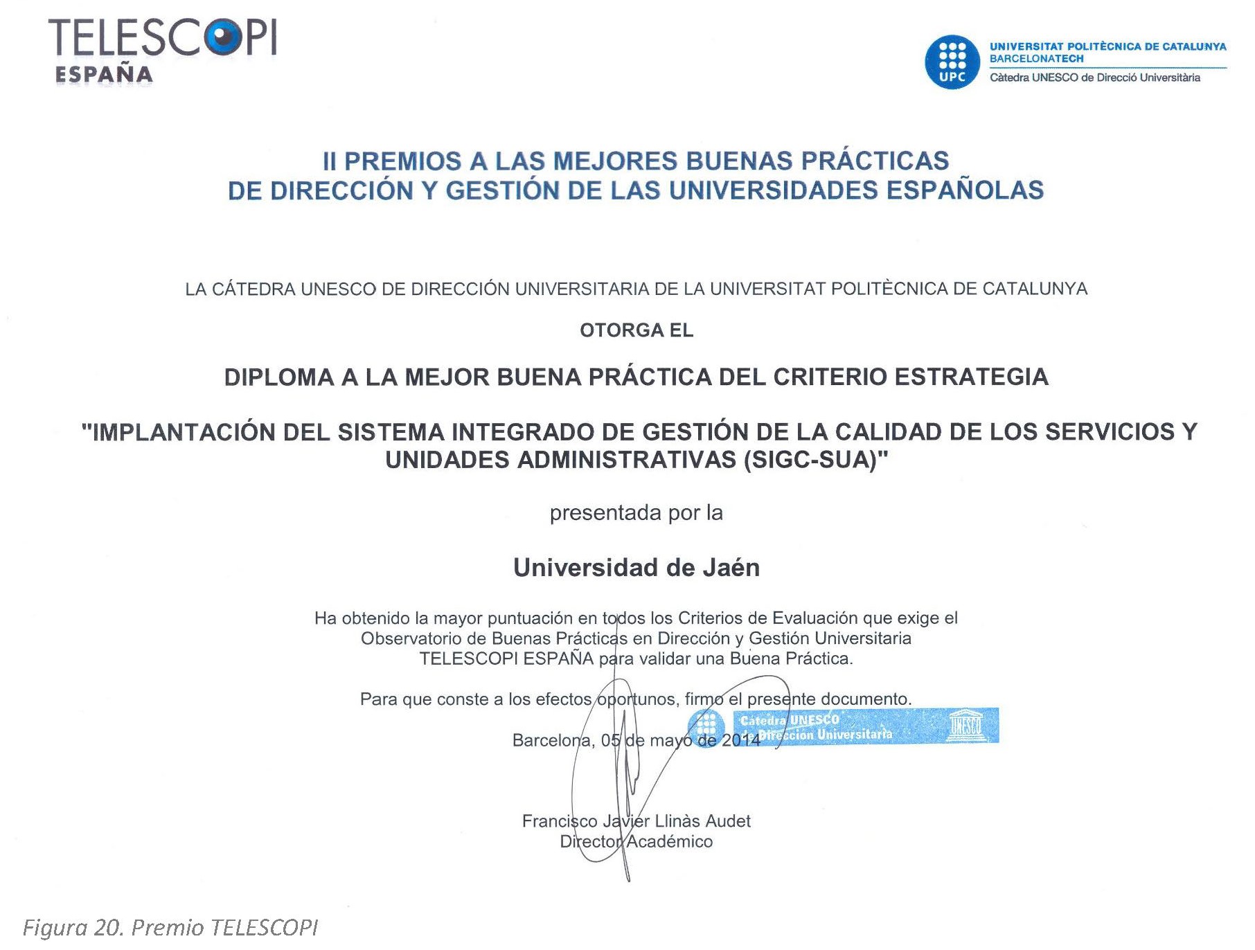 Con la presentación de esta práctica, en su momento, pretendíamos colaborar con la finalidad de TELESCOPI de aportar experiencias estratégicas y de gestión que puedan ser consideradas en el intercambio de conocimientos, además realizar una invitación para realizar benchmarking de procesos y de sistemas de gestión de la calidad. Con esta actualización mantenemos, con más datos sobre los resultados, el mismo propósito, una ver corroborado por el número de presentaciones, jornadas y visitas de otras universidades el interés por la experiencia realizada por la Universidad de Jaén, consolidada, actualmente, por 8 certificaciones del SIGC-SUA y con el máximo reconocimiento del Sello de Excelencia Europea EFQM 500+, pero más convencidos, aún, de la necesidad de seguir aprendiendo compartiendo conocimientos.