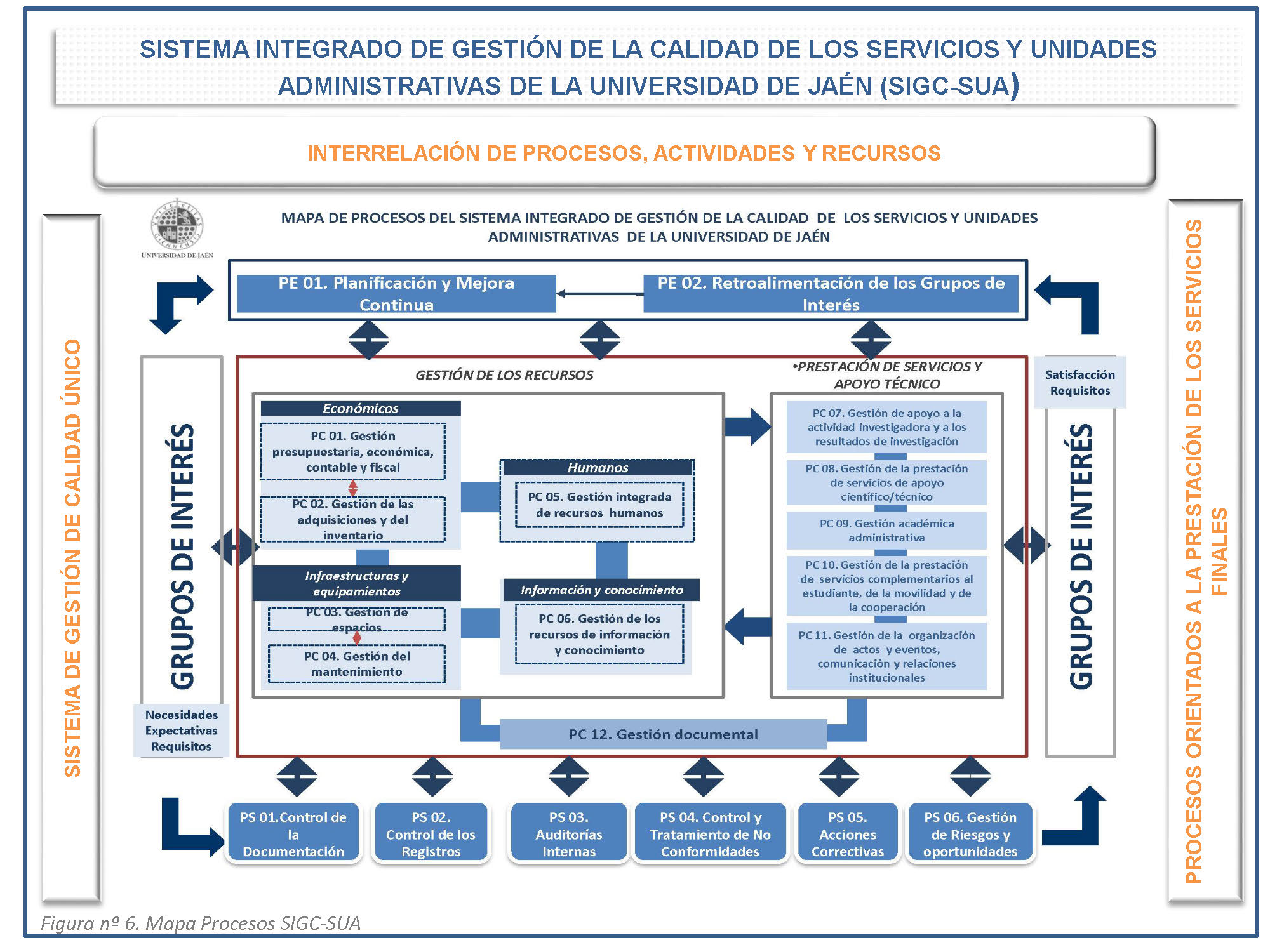 El reto más importante de revisión del SIGC-SUA ha sido la adaptación a los cambios de la Norma ISO. Se ha considerado, documentado e incorporado al SIGC-SUA: el análisis de contexto, las necesidades y expectativas de las partes interesadas y la gestión de los riesgos y oportunidades, dando lugar a cambios en los procesos actuales y enriquecimiento del sistema de mejora continua. Ver Figura 19. [Para una consulta detallada: Orientaciones implantación adaptaciones SIGC-SUA ISO 9001 2015]