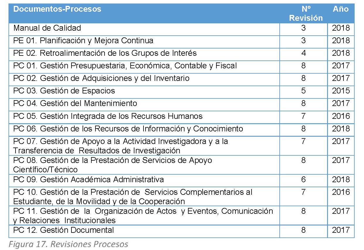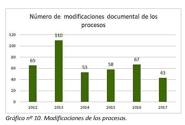 Otro ámbito de revisión y mejora está referido a la gestión del conocimiento que se realiza a través de los objetivos de calidad, acuerdos y directrices y la modificación documental de los procesos: Ver gráficos 9 y 10 y Figura 17 (modificaciones) y 18 (estructura documental revisada)