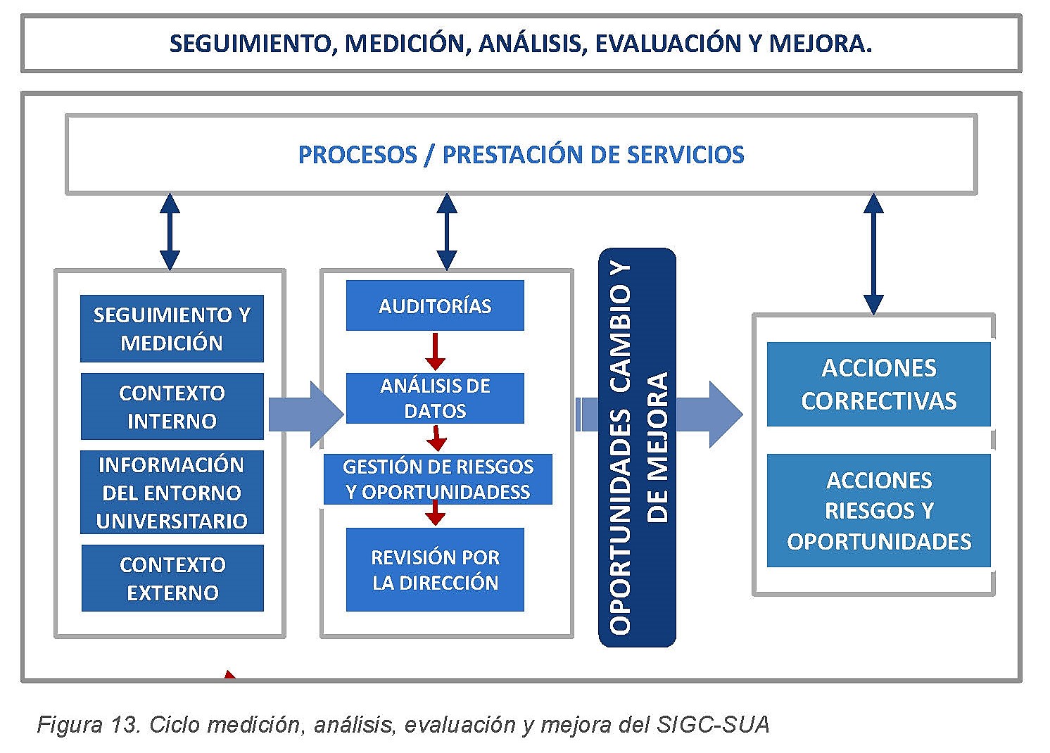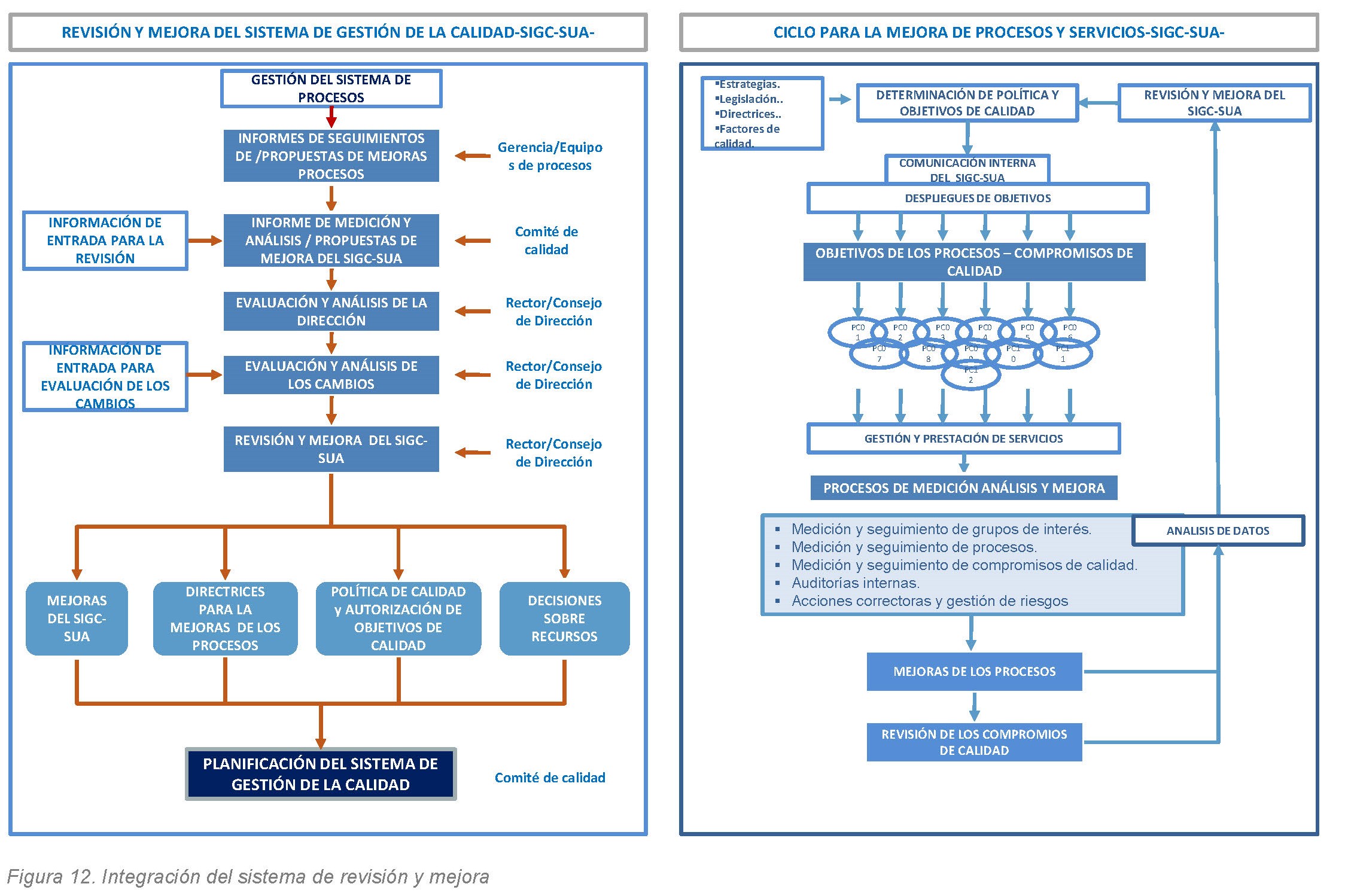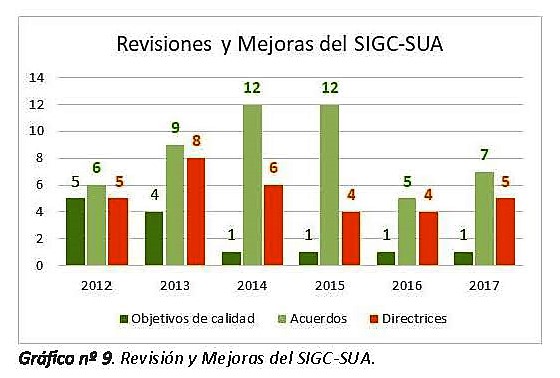 Siendo un sistema integrado para gestionar la calidad y progresar permanentemente en la obtención de resultados excelentes, se hace necesario, además, establecer mecanismos de impulso, capacitación, revisión y mejora. Este proceso va implícito en la propia Norma ISO y con resultados anuales en las mejoras documentales de los procesos y en la revisión y mejora del SIGC-SUA.
