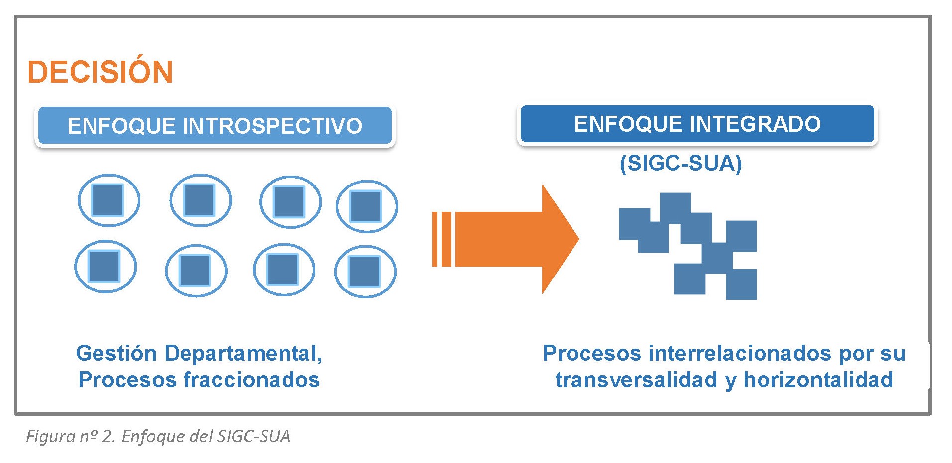 El año 2009 se analizó cuál habría de ser el alcance de la certificación de los sistemas de gestión de la calidad. La disyuntiva estaba entre una certificación para cada unidad o avanzar hacia un enfoque más integrado. A los efectos se realizó un análisis de las fortalezas y debilidades [Ver documento de apoyo 2]. Concluyendo en que el aprendizaje colectivo conseguido podría permitir explorar otra vía: de la introspección a la integración de los sistemas de gestión de la calidad. Más eficaces, eficientes, integradores de la participación y corresponsabilidad, más alineados en la gestión directiva/operativa y más sostenible. Ver figura 2