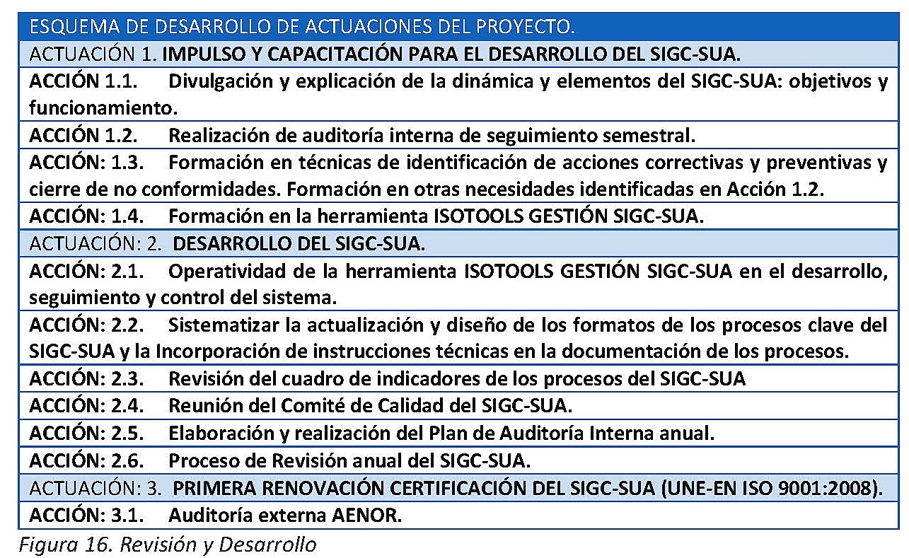Como ejemplo de revisión y desarrollo presentamos las acciones que se establecieron para la realización de un plan tras la certificación inicial: Proyecto Primera Renovación de la Certificación del SIGC-SUA- Norma UNE 9001:2008, marzo 2012: Ver Figura 16