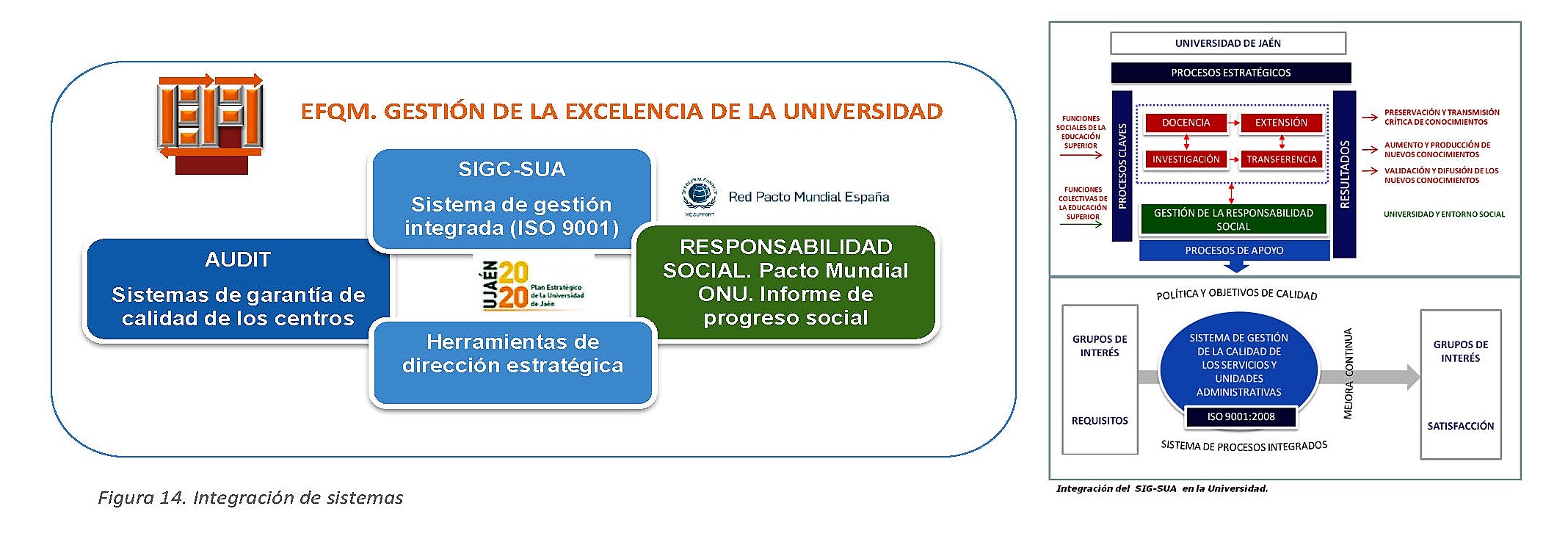 En la universidad de Jaén (UJA) se concretó en el Plan Estratégico 2003-2010 impulsando el cambio hacia una cultura organizacional orientada a los clientes y a la obtención de resultados, mediante el enfoque basado en procesos y la mejora continua. El Plan Estratégico 2014-2020 profundizó en mantener, consolidar e integrar los sistemas de gestión normalizados y avanzar en la estrategia de gestión de la calidad total en la Universidad.