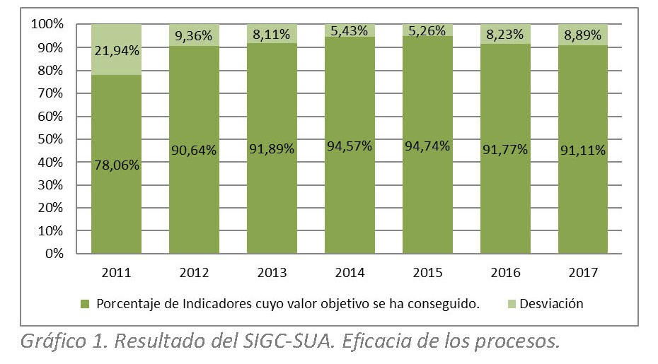 El diseño del SIGC-SUA ha pretendido proporcionar un eficaz desarrollo de ciclo cliente/proveedor interno y una eficiente gestión integrada de los recursos. Además de asegurar un liderazgo efectivo en el despliegue de estrategias, política y objetivos de calidad, en el seguimiento y evaluación de resultados y en la toma de decisiones sobre la mejora. A su vez, habría de impulsar un medio para hacer más efectiva la implicación y participación de las personas y facilitar la integración con otros sistemas de gestión de la calidad de los ámbitos de la gestión académica y, tras su consolidación, constituir una de las fortalezas para la implantación del sistema de gestión global de la Universidad utilizando el referente EFQM.